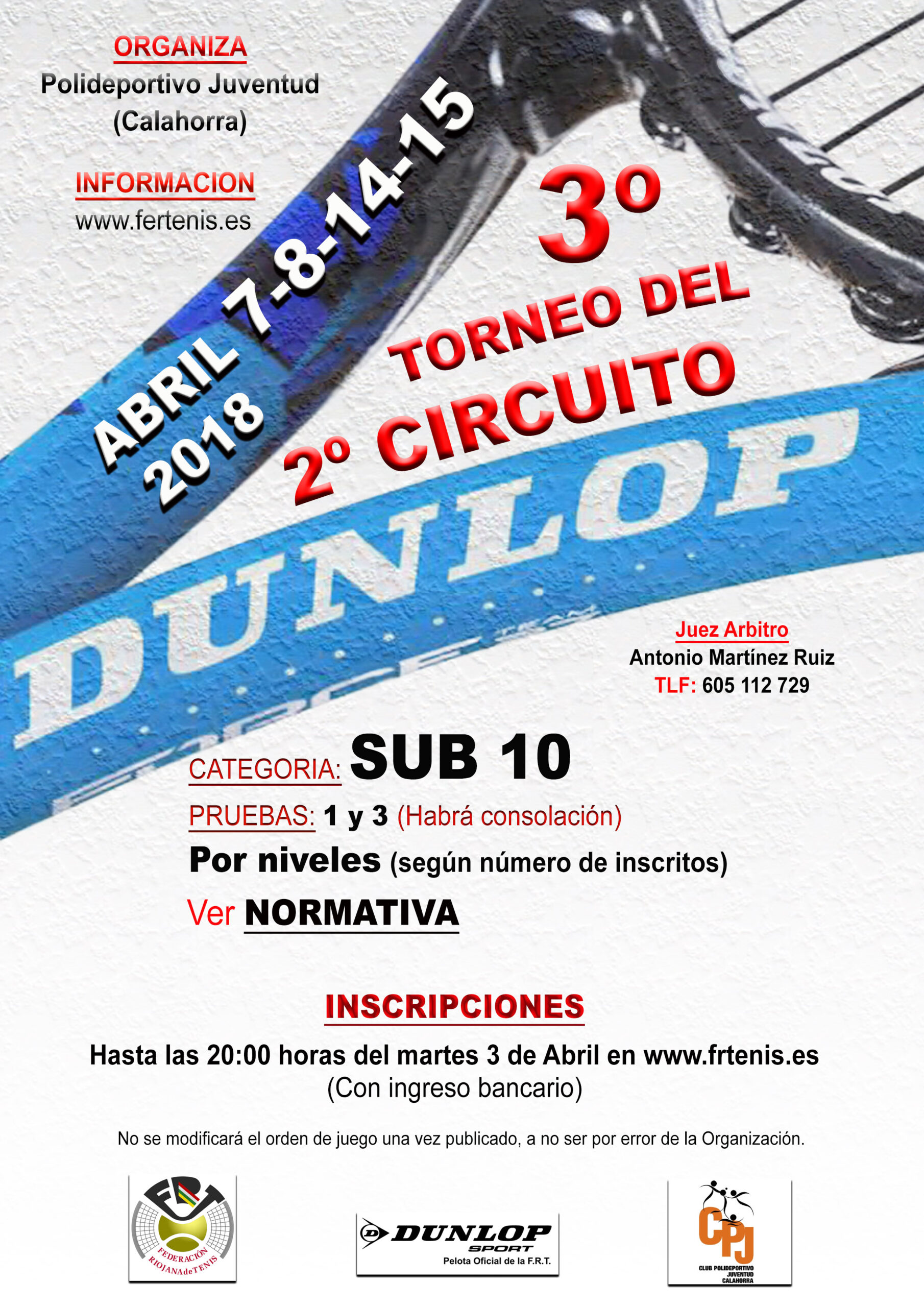 2018 Torneos3ºTORNEO DEL 2º CIRCUITO DUNLOP 2018 19 de marzo de 2018 Suspendido por falta de inscripciones 2018 Arbitros NoticiasCURSO DE RECICLAJE DE JUEZ ARBITRO Y JUEZ DE SILLA 19 de febrero de 2018 El Curso de Formación Permanente CFP Juez de Linea-Juez de Silla y Juez Arbitro (reciclaje) se va a celebrar en Logroño los días 12 y… 2018 Noticias2º TORNEO DEL CIRCUITO DUNLOP 19 de febrero de 2018 En las Instalaciones Deportivas del Centro de Tecnificación “Prado Salobre” se celebró del 10 al 18 de febrero el 2º Torneo del Circuito Dunlop para… 2018 NoticiasXIV OPEN POLIDEPORTIVO JUVENTUD 12 de febrero de 2018 En las Instalaciones Deportivas del Polideportivo Juventud de Calahorra, se disputó del 27 de enero al 4 de febrero el XIV Open Polideportivo Juventud.… 2018 TorneosCAMPEONATO TERRITORIAL DE LA RIOJA DE VETERANOS 2018 4 de marzo de 2018 Orden de juego 24 y 25 de marzo 2018 Torneos3º TORNEO LA LABORAL TENIS CLUB 5 de marzo de 2018 Alevín. 10 y 11 marzo 2018 2018 TorneosBABOLAT CUP 2018 12 de febrero de 2018 Cuadros y C. Consolación y Orden de juego 3 y 4 de marzo 2018 Torneos1º TORNEO VETERANOS 9 de febrero de 2018 Cuadros y orden de juego 3 y 4 marzo 2018 Noticias1º TORNEO INFANTIL DEL CTO. DUNLOP 22 de enero de 2018 El Club de Tenis Beronia, celebró del 13 al 20 de enero en las instalaciones Deportivas de Las Norias el 1º Torneo Dunlop en categoría… Paginación de entradas chevron_left Prev 1 … 5 6 7 Next chevron_right