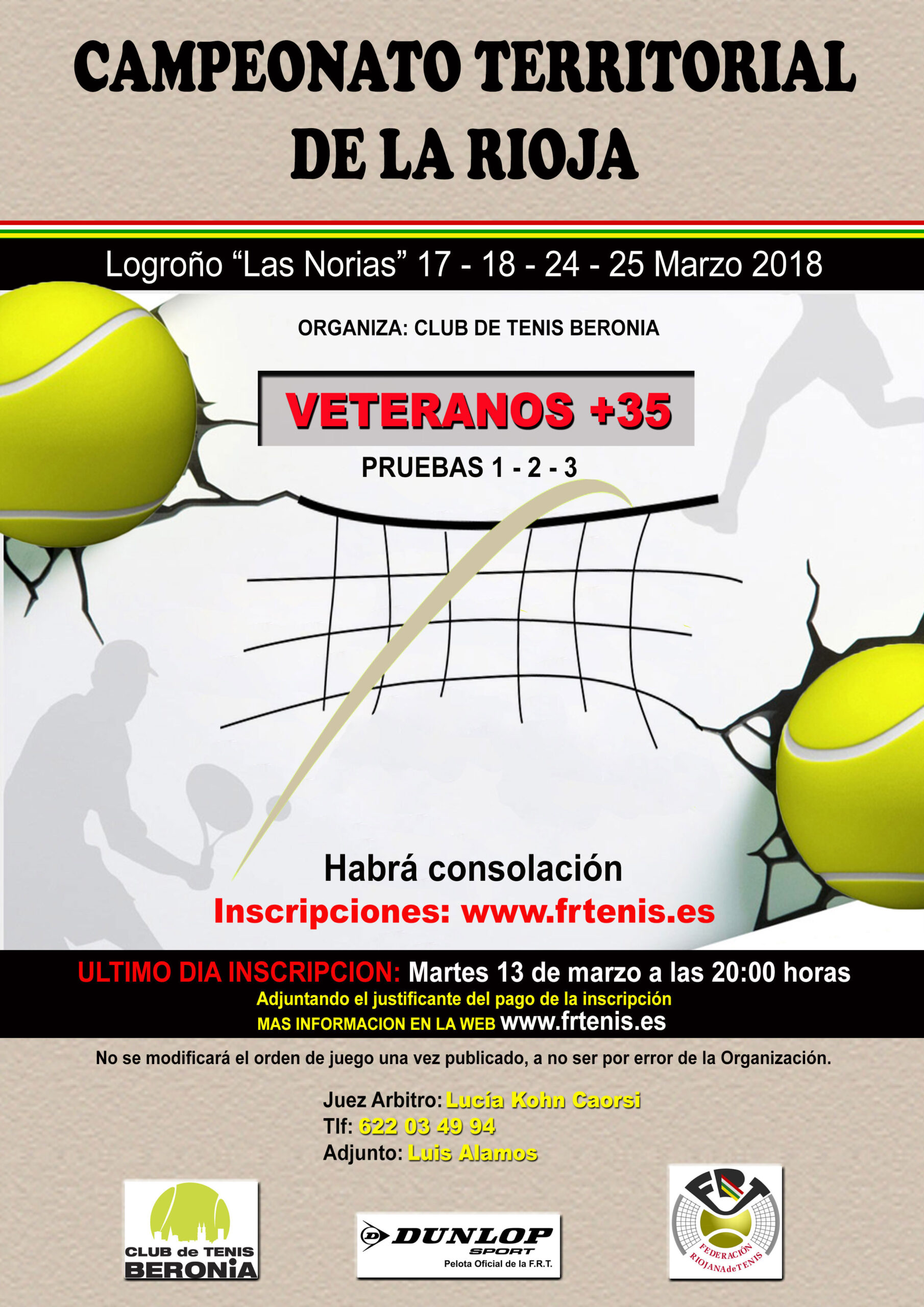 2018 Arbitros NoticiasCURSO DE RECICLAJE DE JUEZ ARBITRO Y JUEZ DE SILLA 19 de febrero de 2018 El Curso de Formación Permanente CFP Juez de Linea-Juez de Silla y Juez Arbitro (reciclaje) se va a celebrar en Logroño los días 12 y… 2018 Noticias2º TORNEO DEL CIRCUITO DUNLOP 19 de febrero de 2018 En las Instalaciones Deportivas del Centro de Tecnificación “Prado Salobre” se celebró del 10 al 18 de febrero el 2º Torneo del Circuito Dunlop para… 2018 NoticiasXIV OPEN POLIDEPORTIVO JUVENTUD 12 de febrero de 2018 En las Instalaciones Deportivas del Polideportivo Juventud de Calahorra, se disputó del 27 de enero al 4 de febrero el XIV Open Polideportivo Juventud.… 2018 TorneosCAMPEONATO TERRITORIAL DE LA RIOJA DE VETERANOS 2018 4 de marzo de 2018 Orden de juego 24 y 25 de marzo 2018 Torneos3º TORNEO LA LABORAL TENIS CLUB 5 de marzo de 2018 Alevín. 10 y 11 marzo 2018 2018 TorneosBABOLAT CUP 2018 12 de febrero de 2018 Cuadros y C. Consolación y Orden de juego 3 y 4 de marzo 2018 Torneos1º TORNEO VETERANOS 9 de febrero de 2018 Cuadros y orden de juego 3 y 4 marzo 2018 Noticias1º TORNEO INFANTIL DEL CTO. DUNLOP 22 de enero de 2018 El Club de Tenis Beronia, celebró del 13 al 20 de enero en las instalaciones Deportivas de Las Norias el 1º Torneo Dunlop en categoría… Paginación de entradas chevron_left Prev 1 … 5 6 7 Next chevron_right